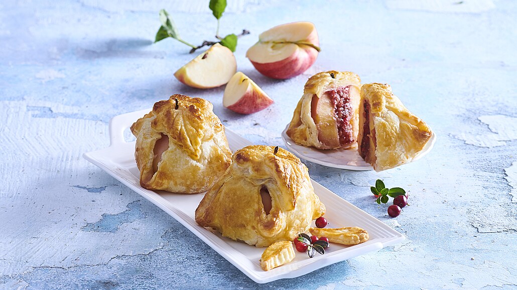 - Jablka přendáme na plech vyložený pečicím papírem a povrch opět potřeme vejcem. Pečeme při 180 °C asi 20 minut. Podáváme teplé.