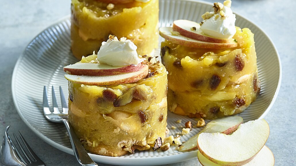 - Jablka oloupeme, nastrouháme a pokapeme citronovou šťávou. Do kastrůlku přendáme jablka, zalijeme je 200 ml jablečného džusu a přivedeme k varu. Ve zbylých 100 ml džusu rozmícháme pudinkový prášek, citronovou kůru, cukr a med a nalijeme k jablkům. Společně povaříme asi 5 minut a přisypeme ořechy a rozinky.