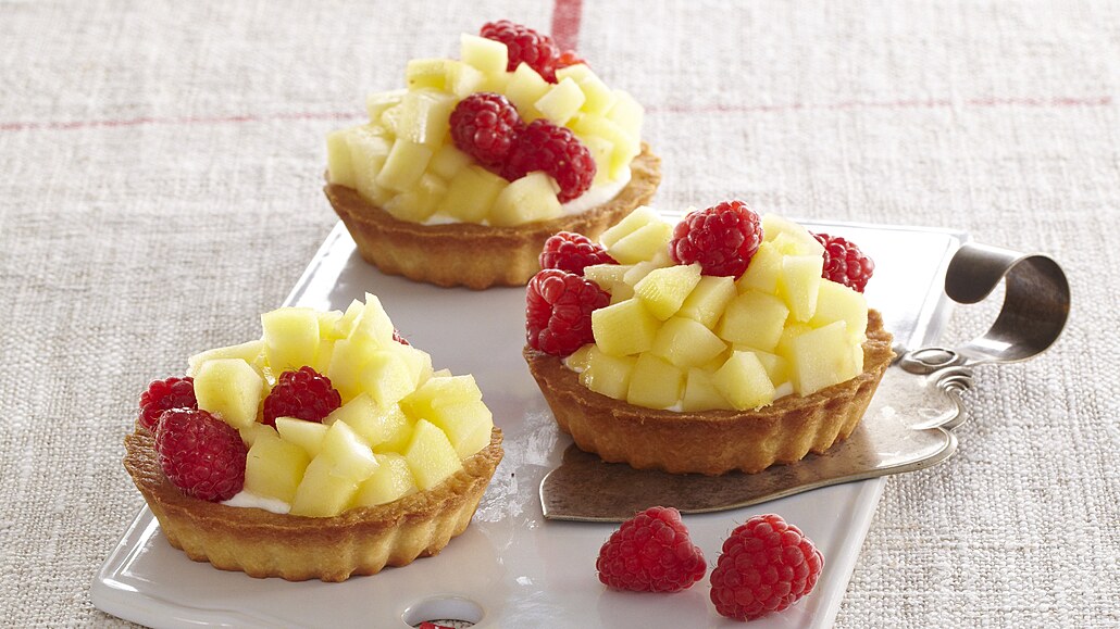 - Krém nastříkáme do košíčků a ozdobíme jablky a malinami. Můžeme přetřít dortovým želé.