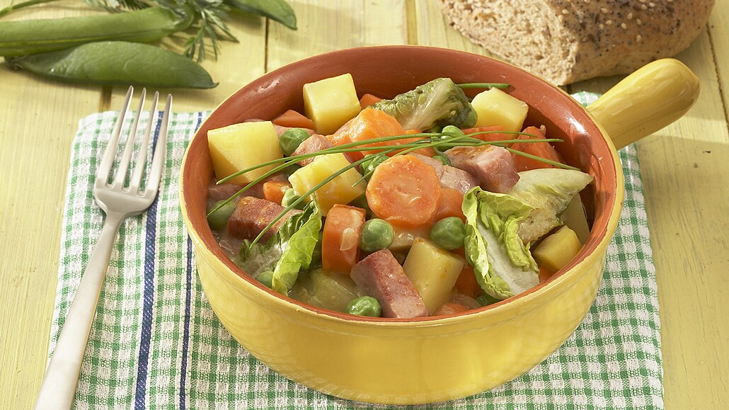 - Z jarního salátu použijeme do jardiniére jen mladé listy a srdíčko, které vložíme do hrnce až úplně nakonec. Necháme jen přejít varem a ihned podáváme s černým chlebem.
