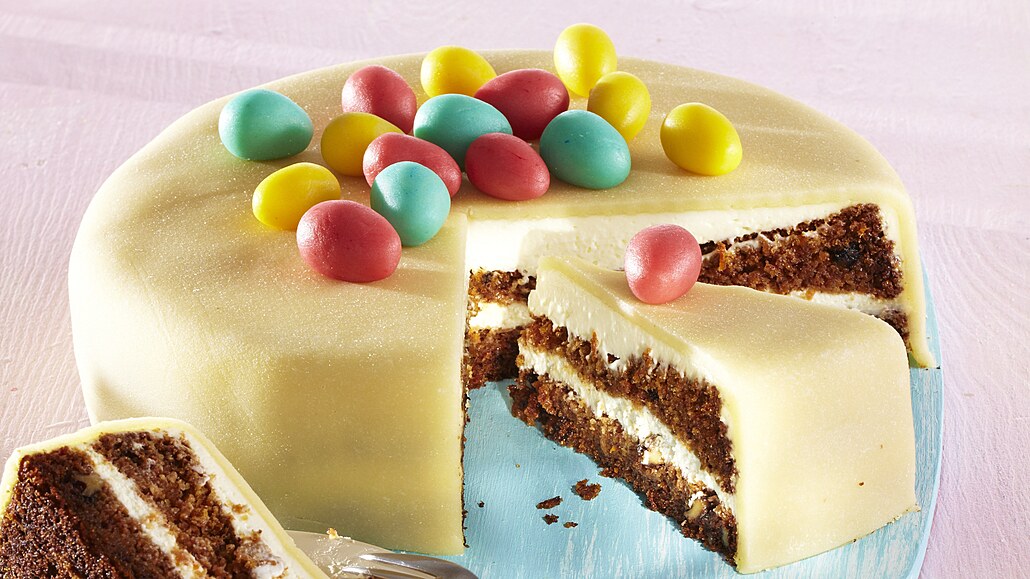 - Marcipánovou hmotu vyválíme na pracovní ploše poprášené moučkovým cukrem na tenký kulatý plát. Dort potáhneme a ze zbytku marcipánu vytvoříme vajíčka a dozdobíme.