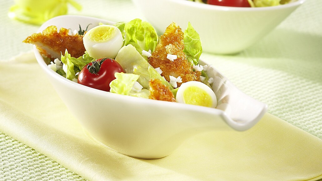 - Salát rozdělíme na jednotlivé listy, které omyjeme a natrháme na kousky. Rajčata opláchneme. Salát s rajčaty rozdělíme do misek a ochutíme připravenou zálivkou. Přidáme kuřecí nugetky, posypeme nasekaným bílkem, ozdobíme bylinkami a podáváme.