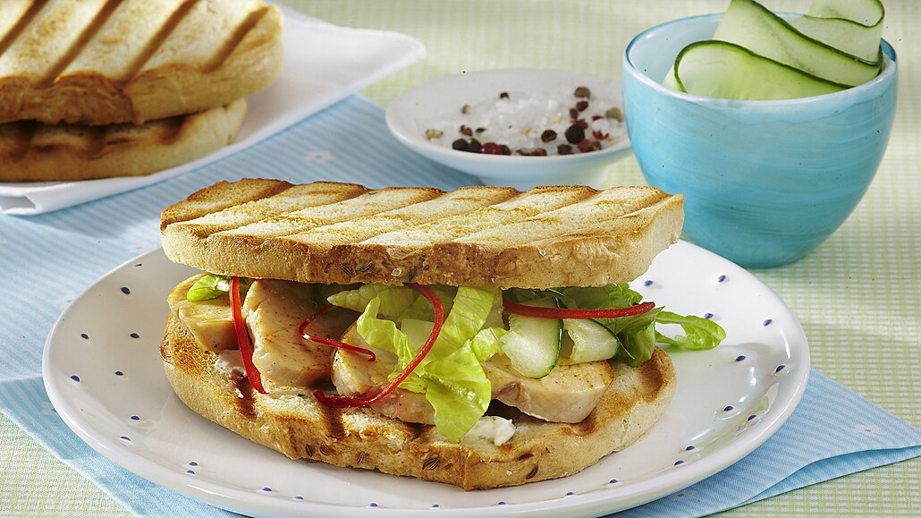 - Čtyři plátky chleba potřeme bylinkovým máslem a poklademe na plátky nakrájenými kuřecími prsíčky. Chlebíčky dozdobíme zeleninou a přiklopíme zbylými toasty.