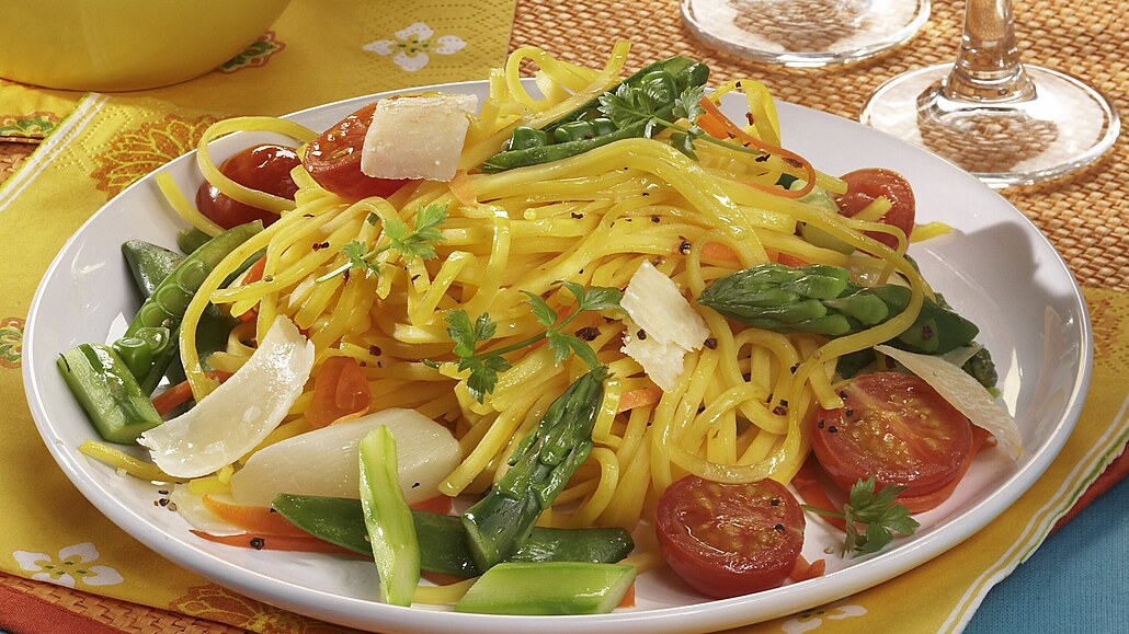 - Chřest oloupeme, odřízneme dřevnaté konce a výhonky rozkrájíme na špalíčky. Hrášek opláchneme a překrojíme. Mrkev očistíme, oloupeme a nakrájíme na tenké nudličky. Rajčata omyjeme a rozpůlíme.