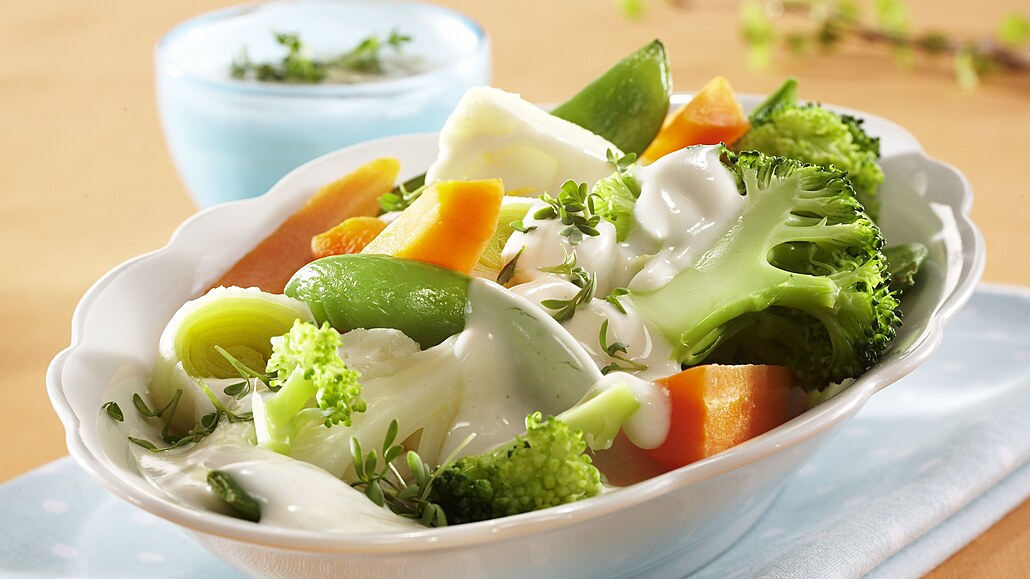 - V hrnku rozšleháme žloutek se 3 lžícemi bešamelu a tuto směs vmícháme zpět do bešamelu v hrnci (už nevaříme!). Vložíme do něj vařenou zeleninu a společně opatrně prohřejeme (nebo zeleninu prohřejeme zvlášť). Ozdobíme bylinkami a podáváme.