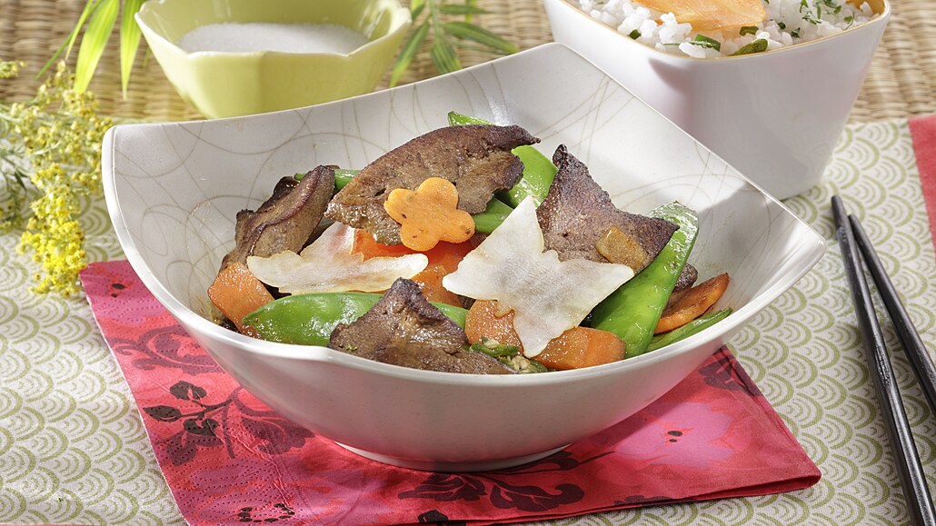 - V misce smícháme 2 lžíce vody se sójovou omáčkou, vínem, cukrem, maizenou, chilli a očištěným, najemno nastrouhaným zázvorem. Zálivku přidáme spolu s orestovanou zeleninou k játrům a mícháme do zhoustnutí. Směs rozdělíme na talíře a ozdobíme okrasně vykrojenými plátky ředkve. Podáváme s vařenou rýží.