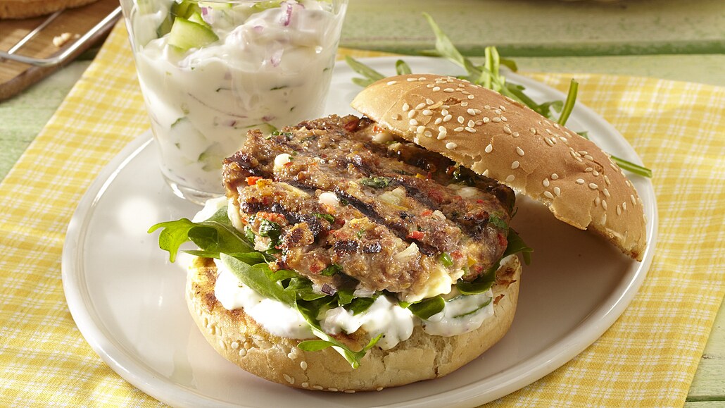 - Žemle nasucho rozpečeme. Rozřízneme je a naplníme trochou tzatziki, lístečky rukoly a karbanátkem.