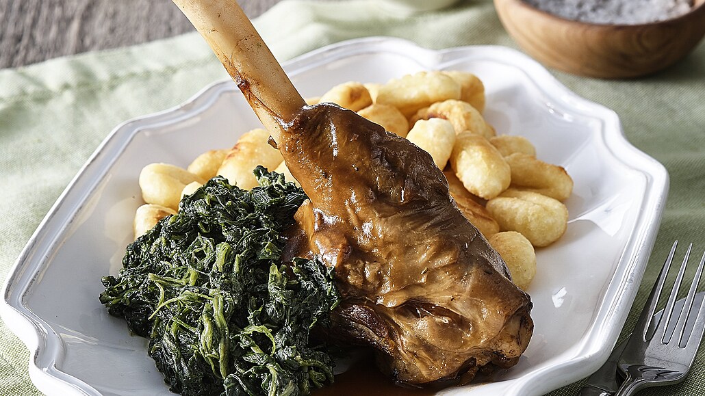 - Jakmile jsou kolínka měkká, vyndáme je z omáčky, zabalíme do alobalu a uchováme v teple. Snítky tymiánu odstraníme a omáčku propasírujeme přes síto. Podle potřeby ji zredukujeme a nakonec zjemníme máslem. Jehněčí kolínka podáváme přelitá připravenou omáčkou. Jako přílohu servírujeme např. opečené bramborové noky a špenát.