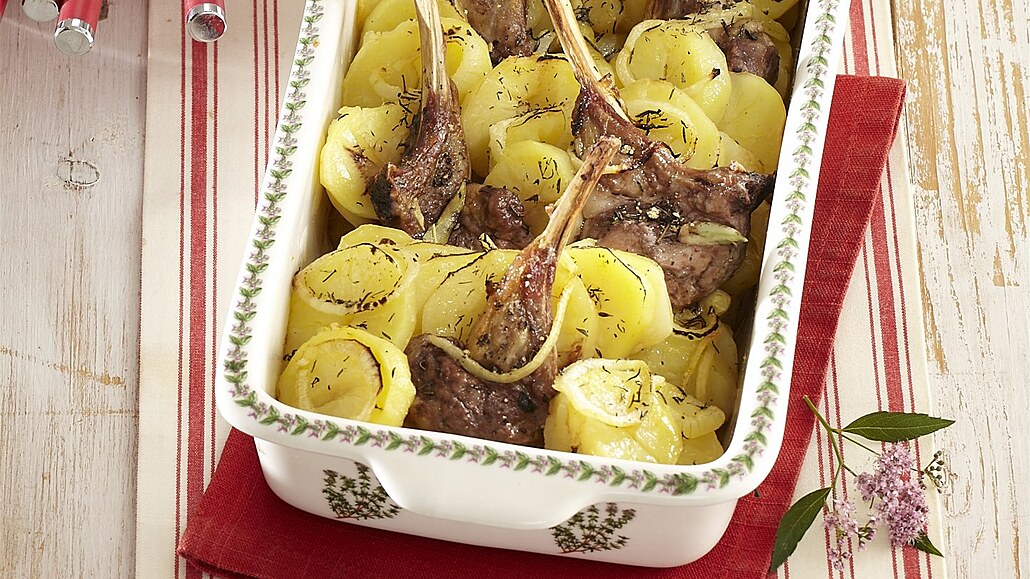- Do máslem vymazaného pekáčku rozložíme polovinu směsi brambor s cibulí, posypeme česnekem a tymiánem. Na tuto vrstvu rozložíme kotletky a obložíme je zbývajícími bramborami s cibulí. Povrch opět posypeme česnekem a tymiánem. Vše zalijeme bujónem a pečeme pod pokličkou při 180 °C asi 40 minut. Pak pokličku odkryjeme a kotlety dopečeme dozlatova.