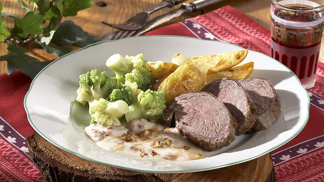 - Jelení hřbet odblaníme, omyjeme a osušíme. Tymián a rozmarýn opláchneme, lístky a jehličky otrháme a nasekáme. Bylinky a citronovou šťávu smícháme s polovinou oleje a maso do této marinády přes noc naložíme.