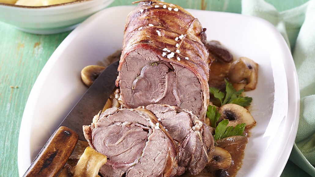 - Maso očistíme, rozkrojíme na větší plát a lehce ho naklepeme. Pak ho osolíme, opepříme a poklademe částí slaniny. Maso stočíme do rolády, obalíme ji zbylou slaninou a převážeme provázkem. Vložíme do pekáče.