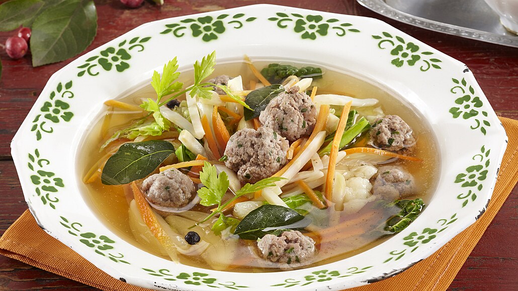 - Uvařené maso umeleme najemno do mísy, přidáme vejce, sůl a libeček. Vše důkladně promícháme a podle potřeby zahustíme strouhankou. Z masové hmoty tvarujeme malé knedlíčky, vkládáme je do vroucí osolené vody a vaříme, dokud nevyplavou na hladinu. Vývar ochutíme sherry a vložíme do něj knedlíčky.