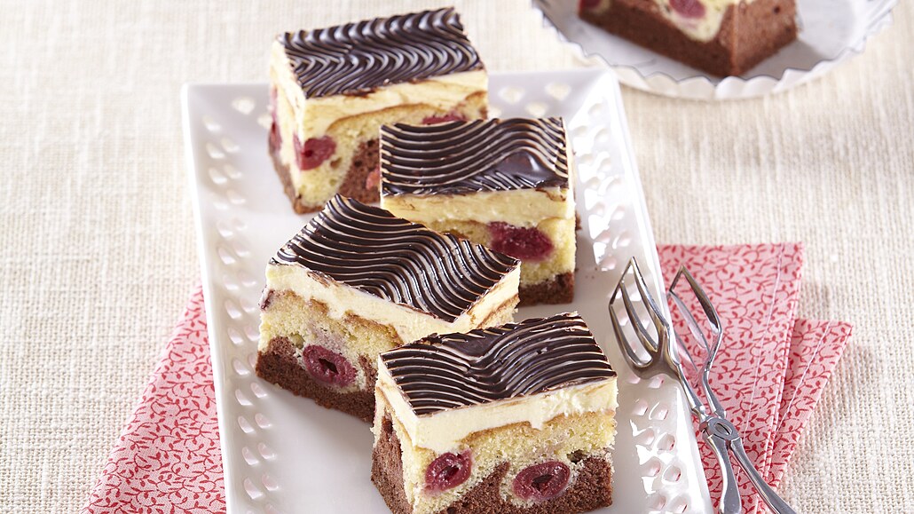 Osvěžující variace na oblíbené řezy doplňuje bohatou nálož višní o jemný krém z tvarohu a citronové šťávy. Čokoládová ganache na povrchu, vytvarovaná do ozdobných vln, krásně vyvažuje svěžest náplně a nadýchanost kakaového korpusu, čímž vzniká neobyčejně lehký dezert.