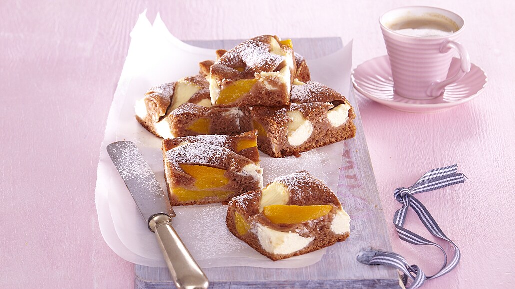 Perníkové řezy s tvarohem a broskvemi jsou vlhký vláčný moučník, kde kakao a perníkové koření obklopí krémový tvaroh a sladkou broskev. Každý řez voní kořením a ovocem zároveň.