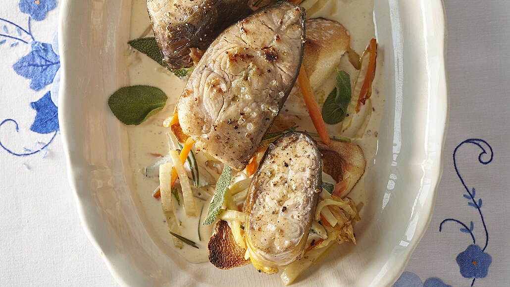 - Rybu z obou stran osolíme a opepříme. Šalotku, česnek a zeleninu oloupeme, šalotku nakrájíme na měsíčky, česnek na plátky, mrkev a celer na nudličky.