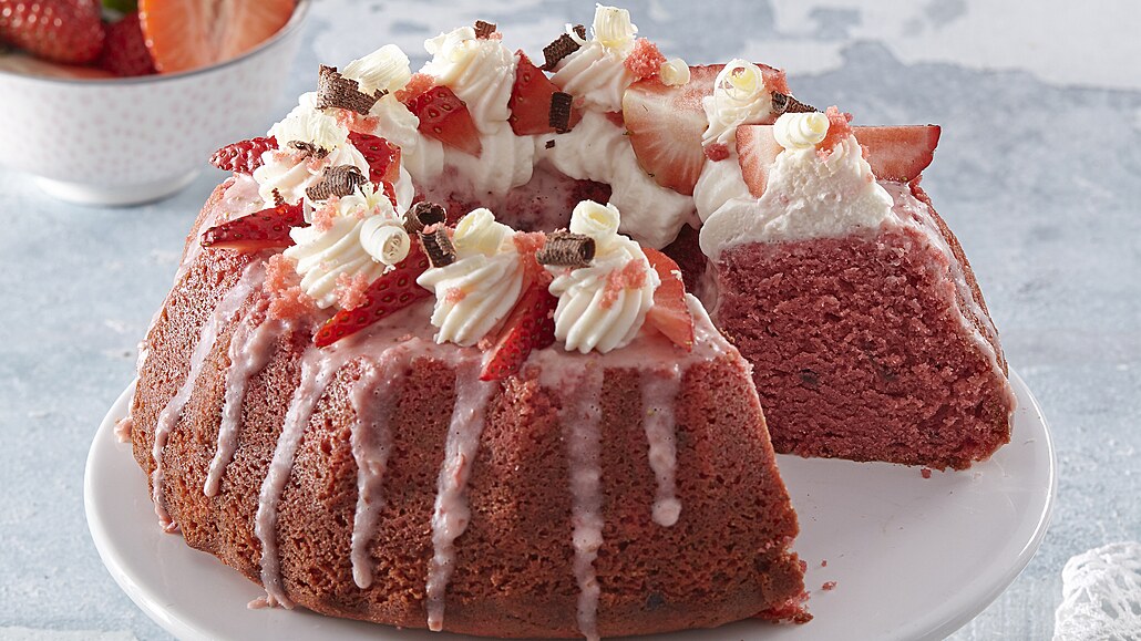Vláčný moučník využívá jemnost jogurtu pro dosažení neuvěřitelně měkkého korpusu se zářivou barvou. Jahodová poleva s čokoládou a nadýchaná šlehačka na povrchu dělají z této bábovky elegantní společnici k odpolední kávě, která svou chutí okamžitě projasní každé rodinné setkání.