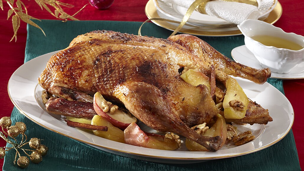 - Jablka omyjeme, zbavíme jádřinců a dužinu pokrájíme na plátky. Kachnu přelijeme džusem, potřeme medem, obložíme jablky, ořechy a nalámanou skořicí a při stejné teplotě ji dopečeme dozlatova.