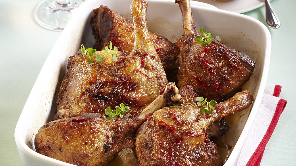 - Kachnu přendáme do pekáče, podlijeme trochou vody a přelijeme marinádou. Vložíme do vyhřáté trouby a při 170 °C pečeme asi 70 minut. Během pečení podléváme podle potřeby vodou a přeléváme výpekem.
