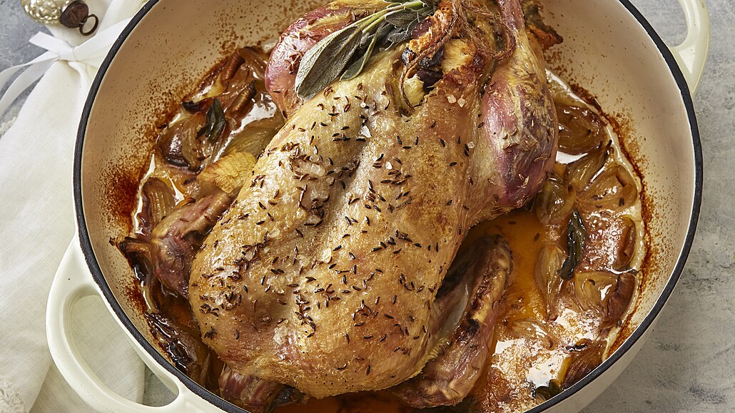 - Celou kachnu pořádně osolíme zvenku i zevnitř a posypeme ji celým kmínem.