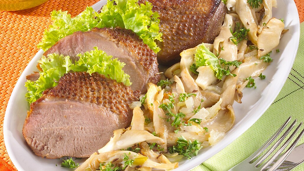 - Na kachním sádle opečeme brambory dozlatova a rozdělíme na talíře. Prsa nakrájíme na plátky, rozdělíme na talíře a přidáme podušené houby.