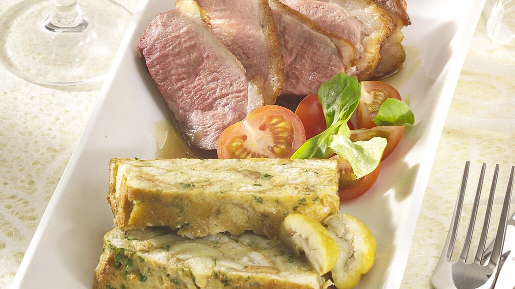 - Kostičky nakrájené veky promícháme s mlékem a žloutky. Přidáme na větší kousky nakrájené kaštany, sekanou petrželku a nakonec vmícháme pevný sníh z bílků. Směs ochutíme muškátovým květem, solí a pepřem a dáme do tukem vymazané a strouhankou vysypané formy. Pečeme v předehřáté troubě při 180 °C asi 20 minut. Nádivku krájíme na plátky a podáváme s kachními prsíčky a omáčkou.
