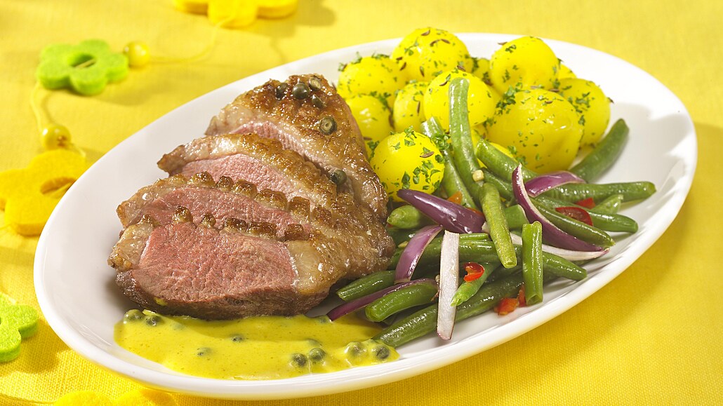 - Kachní prsa očistíme, opláchneme a osušíme. Kůži ostrým nožem nařízneme a potřeme kořením na drůbež.