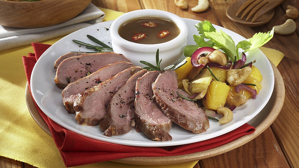 - Upečená prsíčka vyjmeme z pekáčku, nakrájíme na plátky a uchováme teplá. Výpek přelijeme do kastrůlku, zjemníme zbylým máslem, zaprášíme moukou a 5 minut povaříme. Dle potřeby ho naředíme vodou. Štávu můžeme dochutit mletým chilli.
