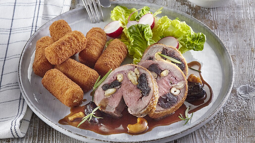- Kachní prsa podélně prořízneme, lehce naklepeme přes igelit, osolíme a opepříme. Položíme je na prkýnko kůží dolů, na každý plát dáme kousek slaniny, švestky, ořechy a nasekaný rozmarýn. Maso poté pevně zarolujeme a svážeme provázkem, aby lépe drželo tvar.