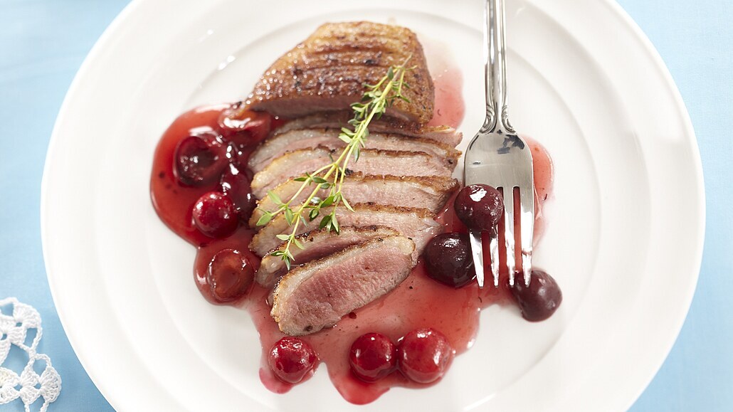 - Šalotku oloupeme a nasekáme nadrobno. Nasypeme ji do výpeku a necháme zesklovatět. Přilijeme vývar s portským vínem a krátce povaříme. Přidáme vypeckované třešně i se šťávou, marmeládu a necháme je prohřát.