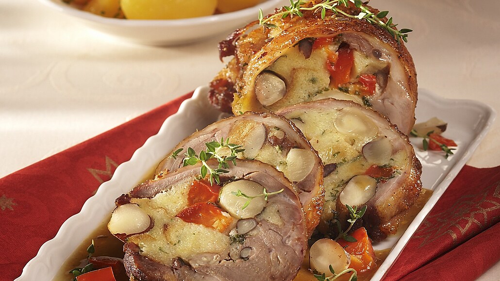 - Připravenou nádivku rozprostřeme na naklepaný plát masa. Vše svineme do rolády a převážeme provázkem.