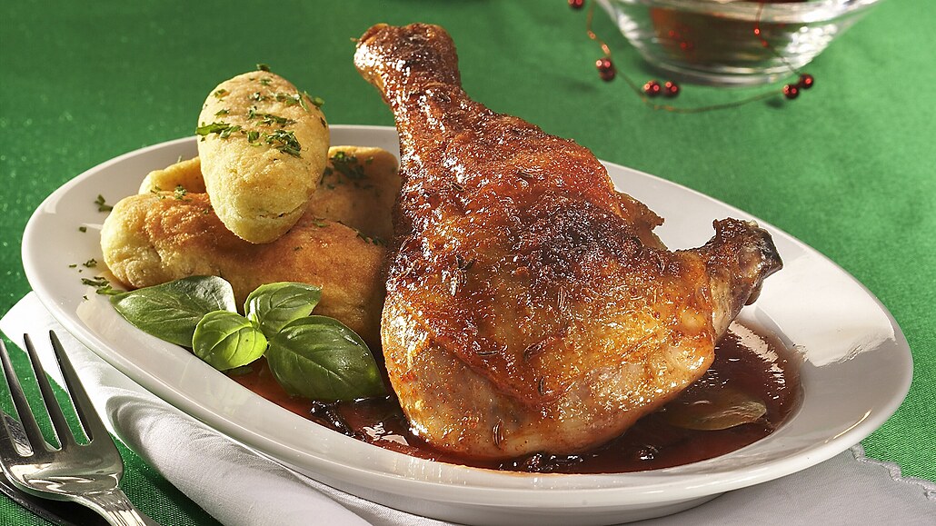 - Upečená stehna vložíme do omáčky a krátce je prohřejeme. Stehna s omáčkou rozdělíme na talíře a ozdobíme bylinkami. Podáváme např. s bramborovými kroketami.