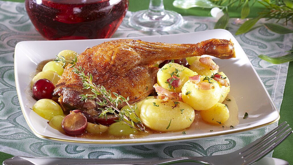 - Nakonec do omáčky vložíme omyté hroznové víno, dochutíme solí a pepřem a zahustíme solamylem. Provaříme a přendáme na talíře. Podáváme s bramborami a ozdobíme čerstvými bylinkami.