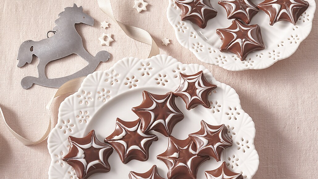 - Hořkou čokoládu i bílou polevu zvlášť rozpustíme nad horkou vodní lázní. Hvězdičky namočíme nejdříve v tmavé čokoládě. Pak do tmavé čokolády pomocí papírového sáčku nastříkáme bílou čokoládu a špejlí nebo párátkem ji ozdobně roztáhneme po obvodu hvězdiček. Necháme zaschnout.