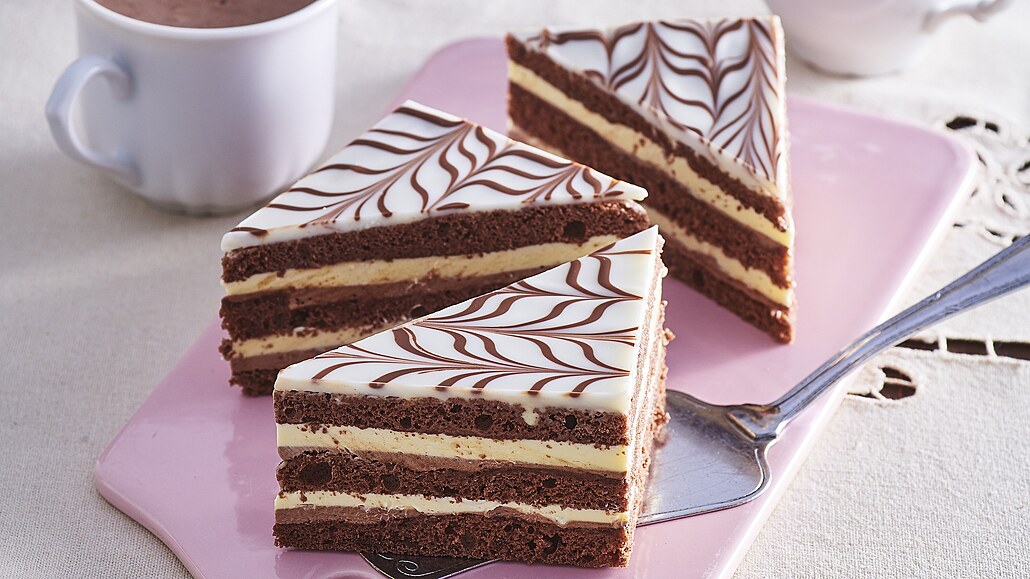 Vícevrstvé kakaové řezy proložené hladkým pudinkovým krémem s rozpuštěnou čokoládou vynikají svou klasickou a poctivou chutí. Efektní mramorování bílou čokoládou na povrchu a precizní krájení do trojúhelníků dodávají moučníku profesionální vzhled. Tento nadýchaný dezert je ideální volbou pro slavnostní hostinu, kde hraje prim souhra kvalitního kakaa.