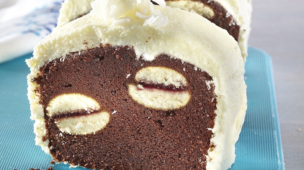 - Piškoty spojíme k sobě po dvou marmeládou. Zvlhčíme je zbylým rumem a zatlačíme do těsta ve formě. Chlebíček pečeme v trobě vyhřáté na 170 °C asi 40 minut.