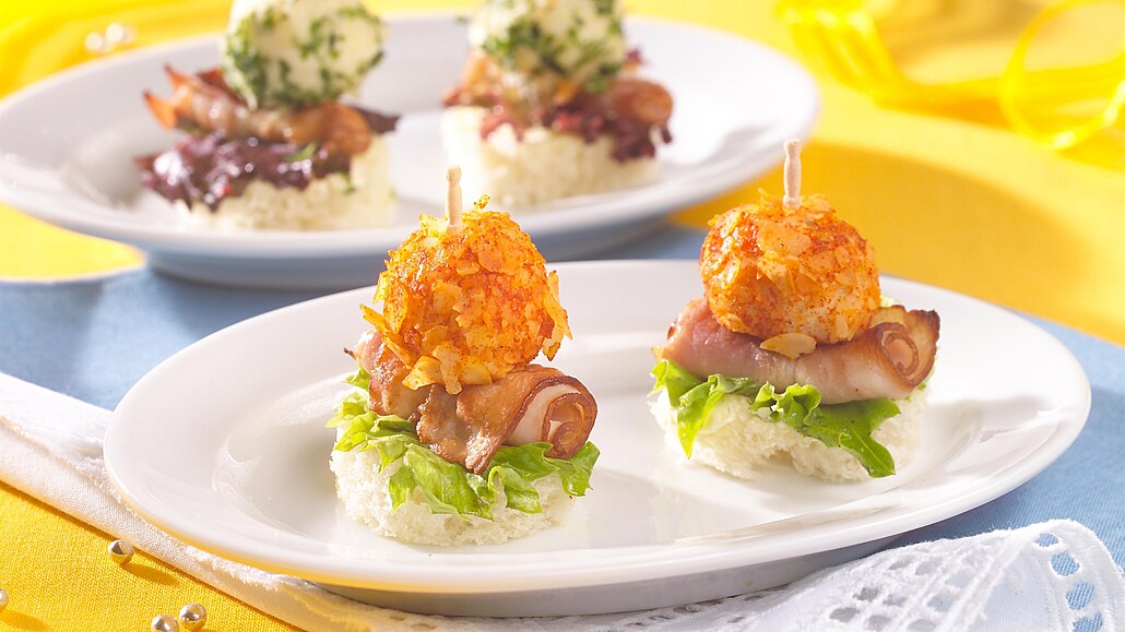 - Plátky anglické slaniny přepůlíme a stočíme do roliček, u kterých opečeme okraje. Položíme je na salát a dáme na ně sýrové kuličky. Paprikové na zelený salát a bylinkové na červený a připevníme je párátkem.