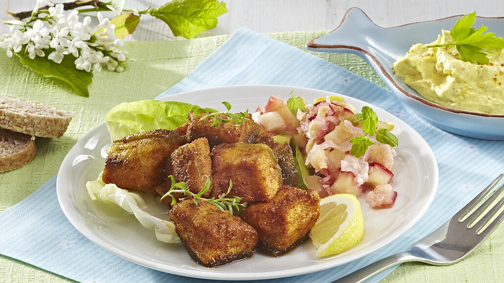 - Kapří maso omyjeme, osušíme, zbavíme kostí a nakrájíme na větší kostky. V misce smícháme hladkou mouku, sůl, mletou papriku a zbylé kari. V připravené směsi obalíme rybí maso a osmažíme je na rozehřátém oleji dozlatova. Poté je dáme na papírový ubrousek, aby odsál přebytečný tuk. Kapra rozdělíme na talíře, ozdobíme bylinkami a doplníme chutney. Podáváme s ochucenou ricottou a pečivem.
