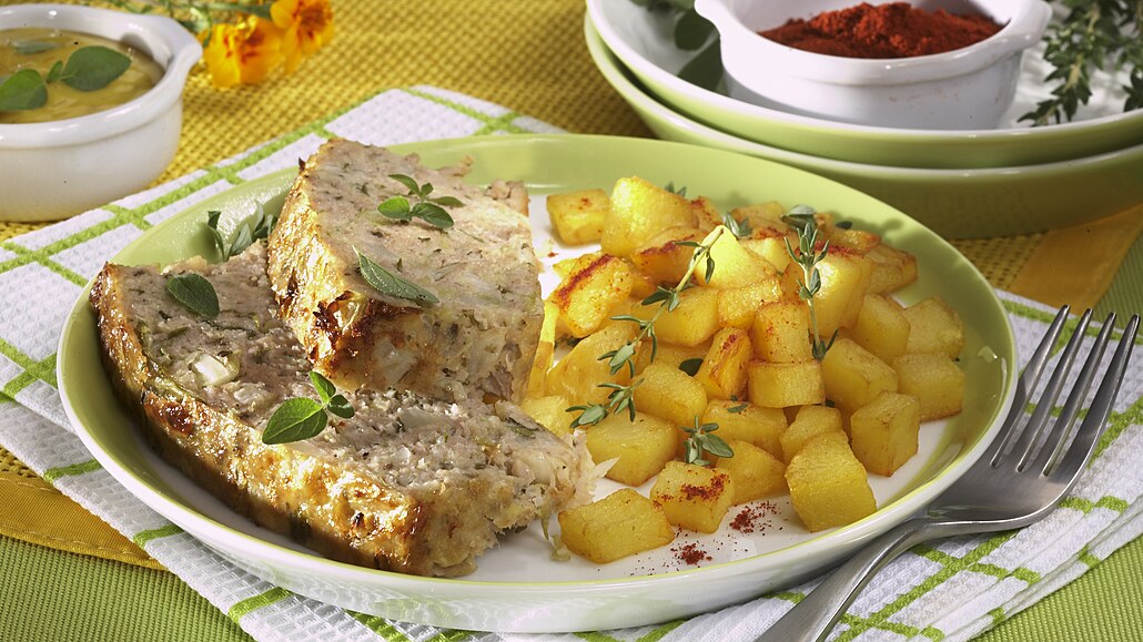 - Masovou směsí naplníme vymazanou a vysypanou formu. V troubě vyhřáté na 190 °C pečeme asi 40 minut. Podáváme s opečenými bramborami.
