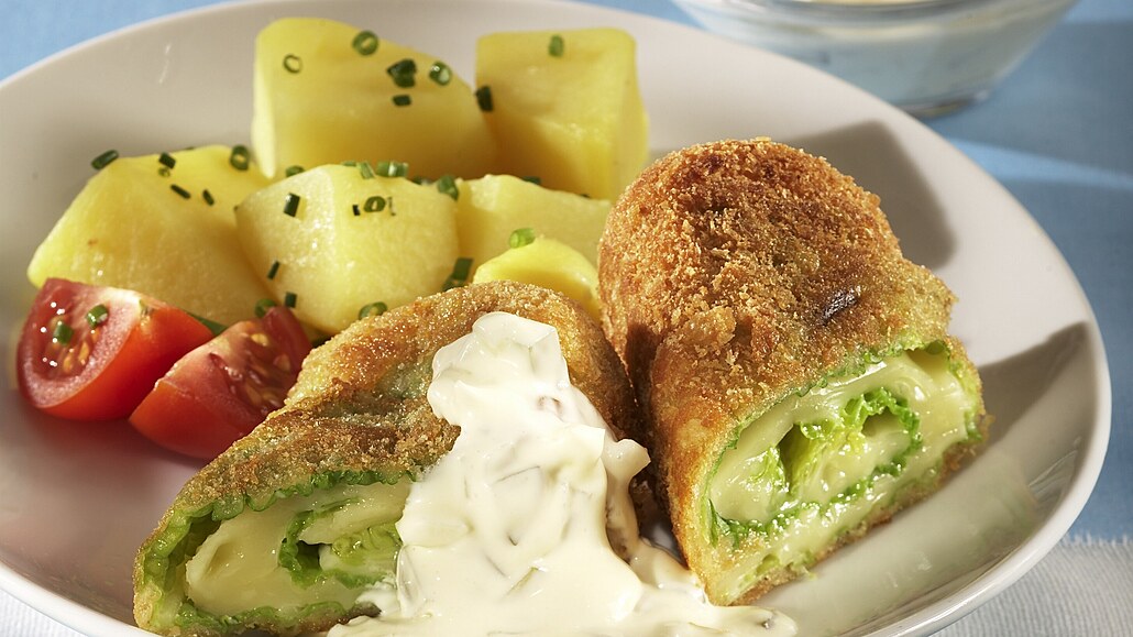 - Balíčky upevníme párátky a obalíme v hladké mouce, osolených rozšlehaných vejcích a strouhance. Na pánvi je ve vyšší vrstvě rozehřátého oleje zvolna usmažíme ze všech stran dozlatova. Podáváme s vařenými nebo šťouchanými brambory a tatarskou omáčkou.