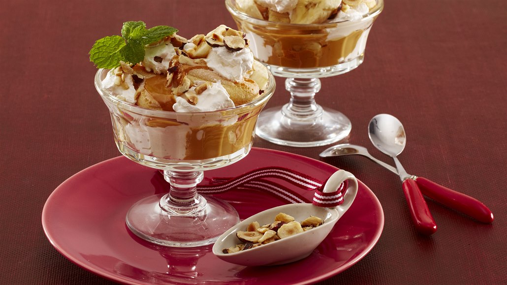 - Do pohárků střídavě vrstvíme cukrářské piškoty, šlehačku, banány a zkaramelizované salko. Nakonec posypeme nasekanými oříšky.