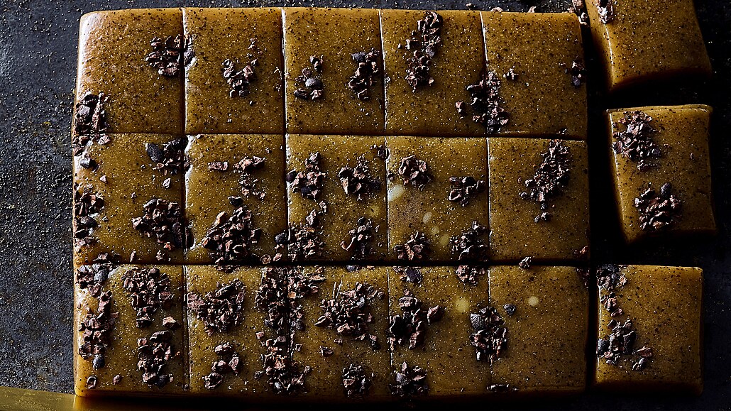 - Karamelovou hmotu nalijeme do pekáčku a posypeme nasekanými boby a necháme tuhnout 12 hodin v chladu a suchu.