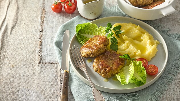 - Vzniklou směs tvarujeme na karbanátky a rozložíme je vedle sebe na tukem vymazaný plech. Pečeme při 180 °C asi 15 minut, v polovině pečení karbanátky obrátíme. Podáváme například s bramborovou kaší.