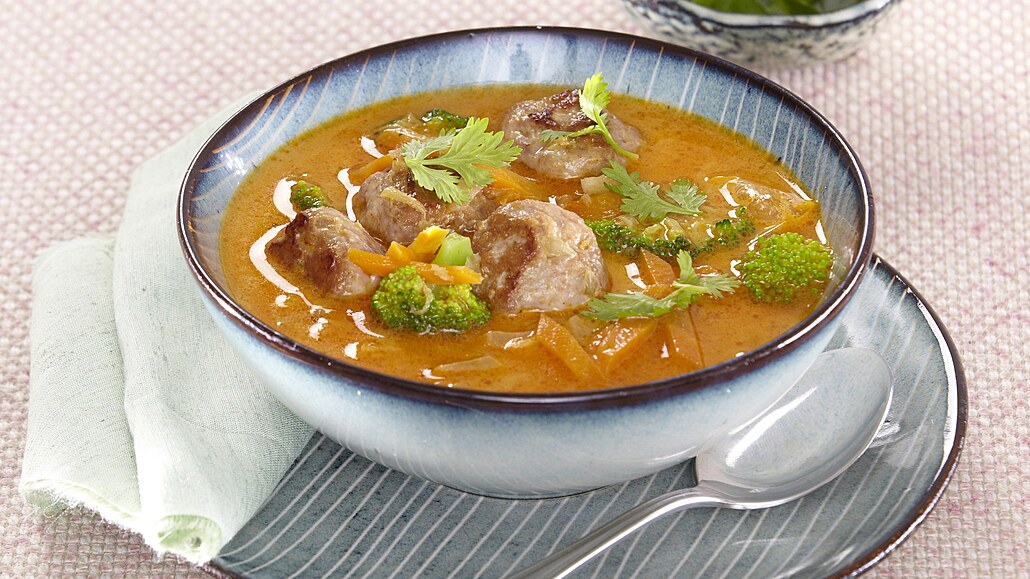 - V kastrolu rozehřejeme olej a necháme na něm zesklovatět cibuli. Přidáme mrkev, kari pastu a krátce orestujeme. Zalijeme vývarem a přidáme kůru z citrusů a přivedeme k varu. Když je mrkev poloměkká, přidáme brokolici a vaříme asi 2 minuty. Pak přilijeme kokosové mléko, přimícháme šťávu ze zbylého zázvoru, vložíme upečené knedlíčky i s výpekem a krátce povaříme. Těsně před podáváním podle chuti osolíme, přidáme listy koriandru a rozdělíme do misek.