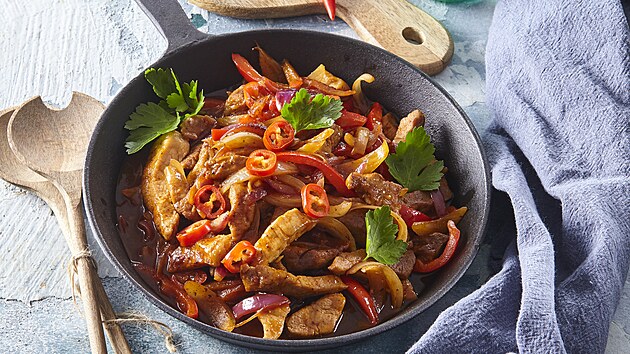 - Maso nakrájíme na nudličky, ochutíme solí, pepřem, sójovou omáčkou a dle chuti přidáme utřené chilli, necháme odležet v chladničce.