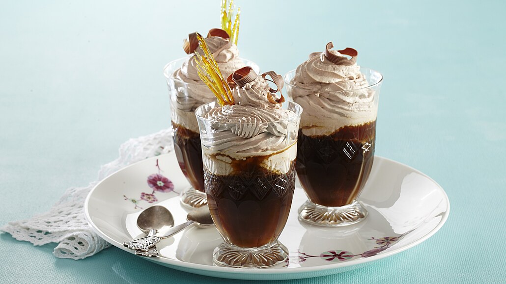 - Do skleniček dáme instantní kávu, zalijeme ji horkou vodou asi do poloviny výšky skleniček. Šlehačku naplníme do cukrářského sáčku s řezanou trubičkou a nastříkáme na kávu. Nakonec můžeme dozdobit hoblinkami čokolády a nalámaným zatuhlým karamelem.