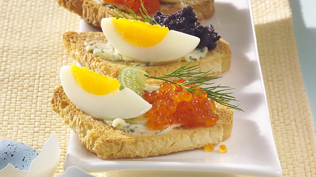 - Na každý toast dáme trochu kaviáru, položíme čtvrtinu vejce a ozdobíme snítkou kopru a kouskem limetky.