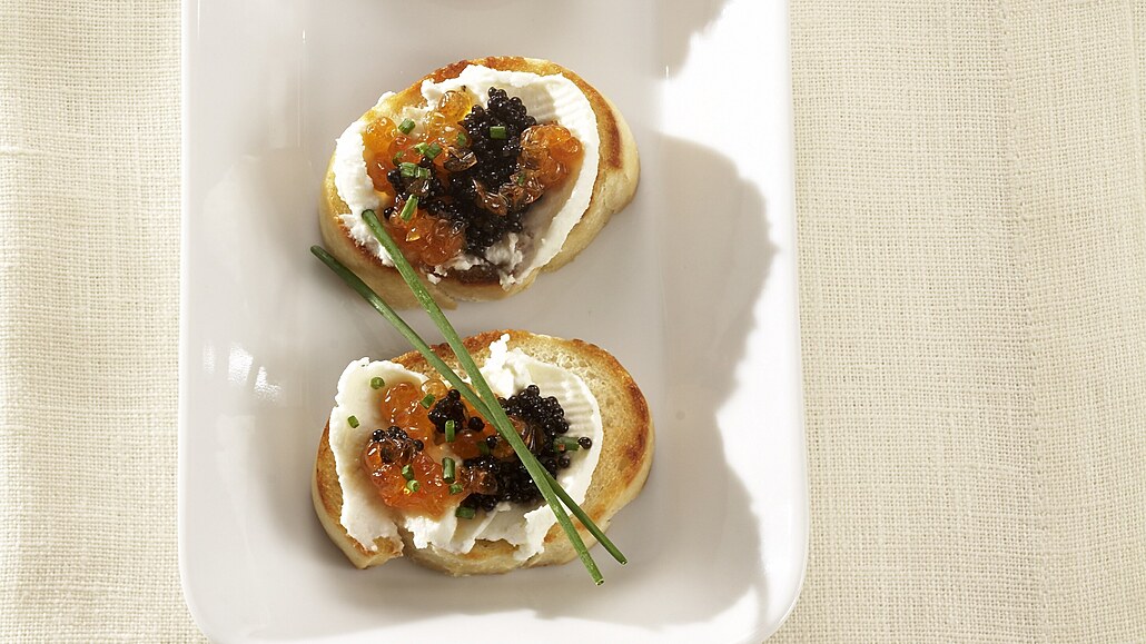 - V misce smícháme mascarpone s tvarohem a podle chuti okyselíme. Kdo chce, může směs také trochu přisolit, ale je třeba počítat s chutí kaviáru. V druhé misce zlehka promícháme kaviár s pažitkou.