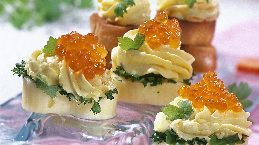 - Petrželku na prkénku nadrobno nasekáme a přendáme ji na mělký talíř. Sýrová srdce na jedné straně jen lehce potřeme připravenou pomazánkou a položíme je na nasekanou petrželku. Pak sýrová srdce a opečené bagety ozdobíme pomazánkou ze zdobicího sáčku, červeným a černým kaviárem a mrkvovými srdíčky.