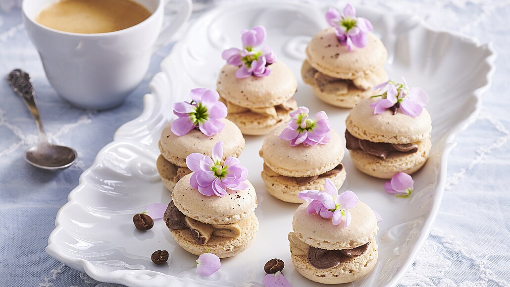 - Těsto dáme do cukrářského sáčku a na plech nastříkáme v dostatečném rozestupu stejně veliká kolečka, může nám v tom pomoci podložka na pečení makronek. Každé kolečko posypeme mletou kávou a necháme 20 minut zaschnout (tento krok nesmíme vynechat). Pečeme při 150 °C asi 18 minut, vyjmeme z trouby a necháme zcela vychladnout.