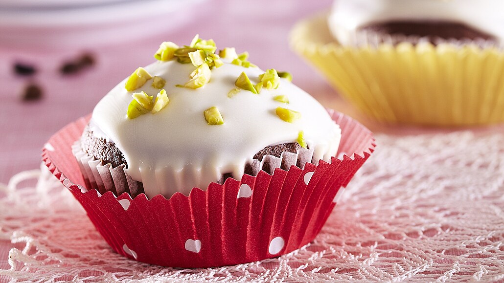- Bílou čokoládu rozpustíme ve vodní lázni. Vršky zchladlých muffinů namočíme do čokolády a posypeme nasekanými pistáciemi.